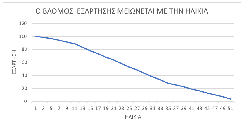Εδώ θα αυθαιρετήσω δημιουργώντας μια κλίμακα. Η κλίμακα αυτή, μας λέει πόσο (κατά τη γνώμη μου) είναι αναμενόμενο να εξαρτάται ένας άνθρωπος σε κάθε ηλικία.