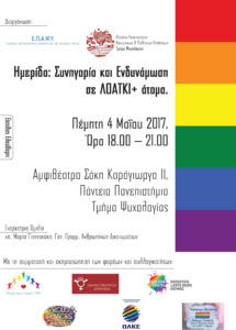 Εν συνεχεία, θα ακολουθήσει στρογγυλή τράπεζα με θέμα την εκπροσώπηση ΛΟΑΤΚΙ+ φορέων και τη διεκδίκηση των δικαιωμάτων. Θα εισηγηθούν η κα. Μαρίνα Γαλανού, πρόεδρος του Συλλόγου Υποστήριξης Διεμφυλικών (ΣΥΔ), η ψυχολόγος κα. Όλγα Χριστίδη εκ μέρους της Color Youth, εκπρόσωποι από την Ομοφυλοφιλική Λεσβιακή Κοινότητα Ελλάδος (ΟΛΚΕ), το φορέα υποστήριξης ΛΟΑΤΚΙ+ ατόμων άνω των 50 ετών Proud Seniors Greece. Τέλος, θα εκπροσωπηθεί το εργαστήριο σπουδών φύλου του Τμήματος Κοιν. Πολιτικής του Παντείου Παν. από την ψυχολόγο κα. Νάνσυ Παπαθανασίου. Την τράπεζα θα σχολιάσουν ο Καθ. κ. Στέλιος Στυλιανίδης και ο ψυχολόγος κ. Λάβδας Μιχάλης εκ μέρους της Εταιρείας Περιφερειακής Ανάπτυξης και Ψυχικής Υγείας (ΕΠΑΨΥ).