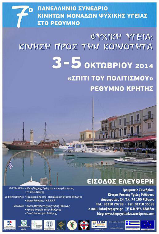 Η Κινητή Μονάδα Ψυχικής Υγείας Ρεθύμνου σας καλεί να συμμετέχετε στις εργασίες του 7ου Πανελληνίου Συνεδρίου Κινητών Μονάδων Ψυχικής Υγείας, που θα πραγματοποιηθεί στην αίθουσα το «Σπίτι του Πολιτισμού», Βερνάρδου 12 στο Ρέθυμνο, από 03-05 Οκτωβρίου 2014.