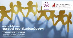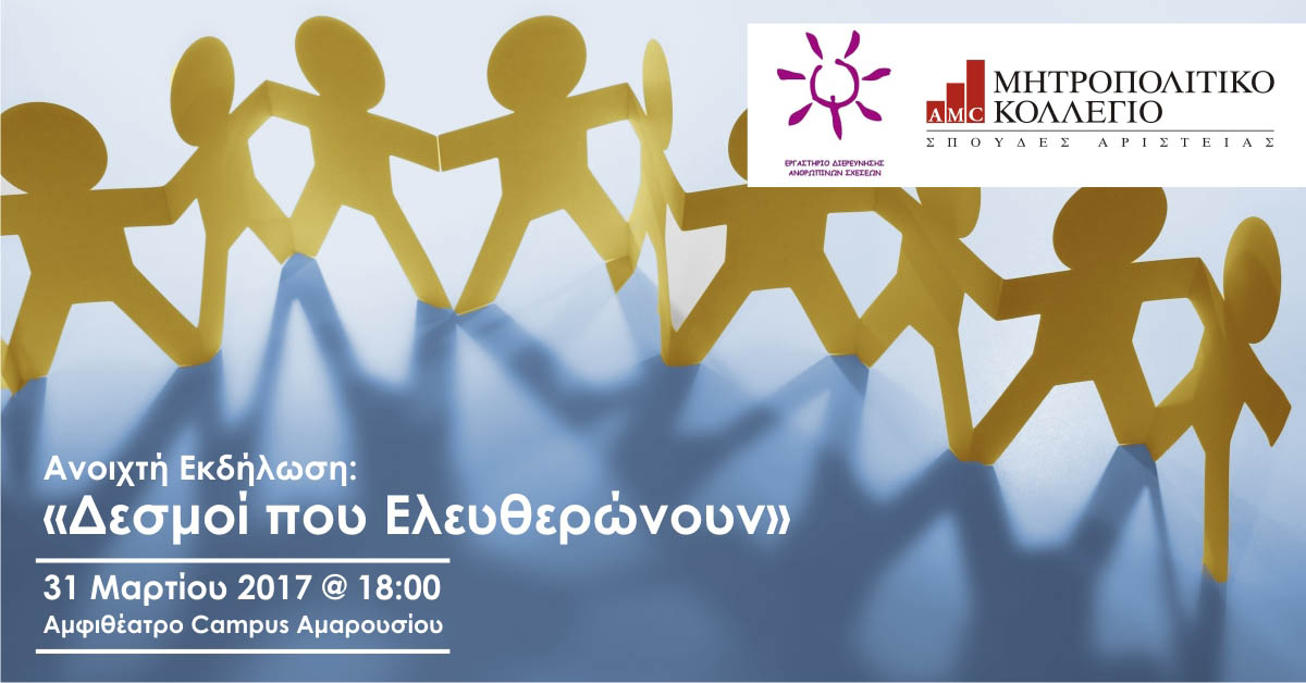 Το Τμήμα Ψυχολογίας του Μητροπολιτικού Κολλεγίου και το Εργαστήριο Διερεύνησης Ανθρώπινων Σχέσεων διοργανώνουν ανοιχτή εκδήλωση με θέμα «Δεσμοί που Ελευθερώνουν» την Παρασκευή 31 Μαρτίου 2017 και ώρα 18:00 στο Αμφιθέατρο του Μητροπολιτικού Κολλεγίου στο Μαρούσι (Σωρού 74).