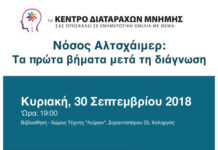 Το Κέντρο Διαταραχών Μνήμης σας προσκαλεί σε ενημερωτική εκδήλωση με θέμα: "Νόσος Αλτσχάιμερ: τα πρώτα βήματα μετά τη διάγνωση".