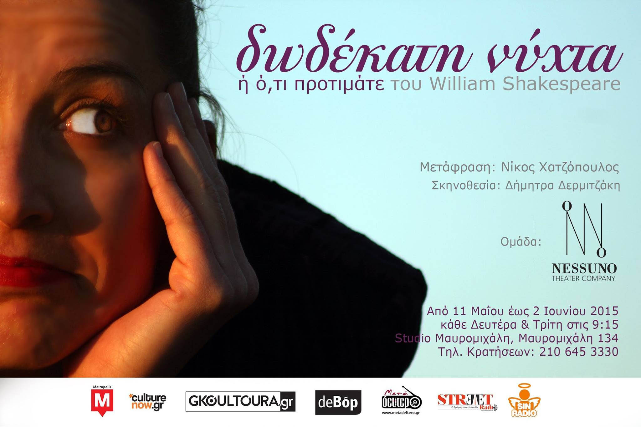 Dodekati nixta i oti protimate parastasiΗ νέα θεατρική ομάδα Nessuno Theater Company παρουσιάζει από τις 11 Μαΐου 2015 στο Studiο Μαυρομιχάλη τη «Δωδέκατη Νύχτα ή ό,τι προτιμάτε» του William Shakespeare σε μετάφραση Νίκου Χατζοπουλου και σκηνοθεσία Δήμητρας Δερμιτζάκη.