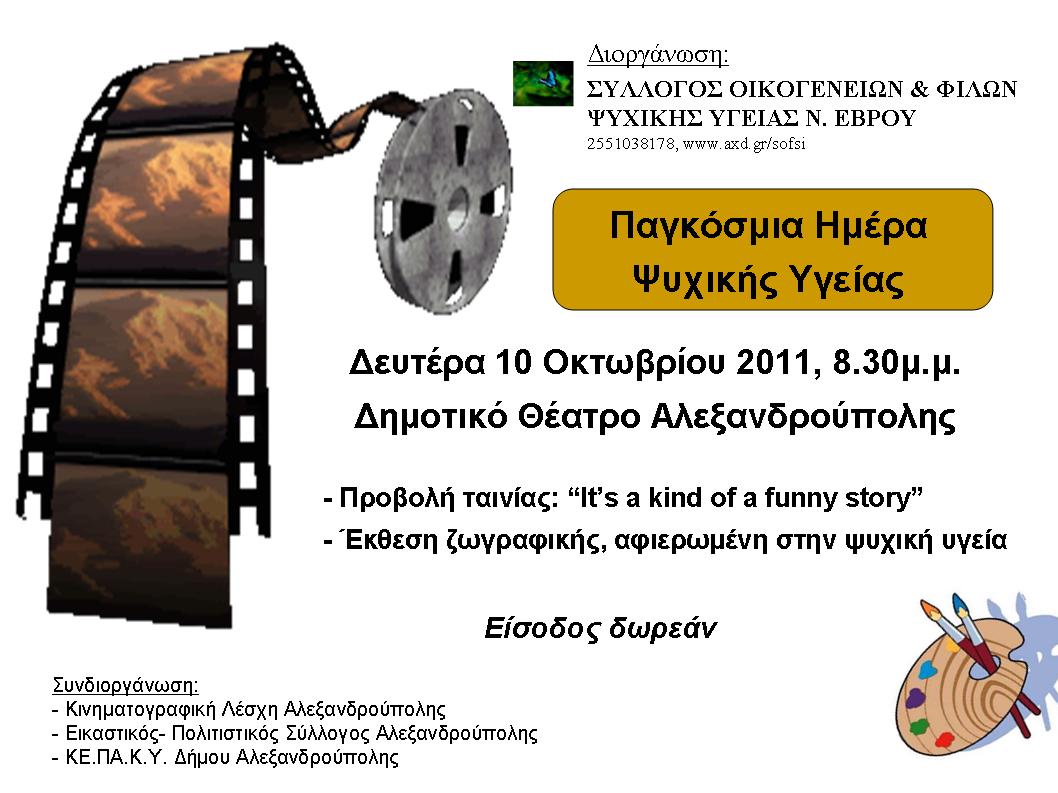 Ο Σύλλογος Οικογενειών & Φίλων Ψυχικής Υγείας σας προσκαλεί στην προβολή ταινίας με τίτλο «It’s a kind of a funny story», με αφορμή τον εορτασμό της Παγκόσμιας Ημέρας Ψυχικής Υγείας, τη Δευτέρα 10 Οκτωβρίου 2011 & ώρα 8.30μ.μ. στην αίθουσα του Δημοτικού Θεάτρου Αλεξανδρούπολης. Στην είσοδο, θα υπάρχει έκθεση ζωγραφικής, αφιερωμένη στην ψυχική υγεία. Η παρουσία σας θα μας χαροποιήσει ιδιαίτερα.