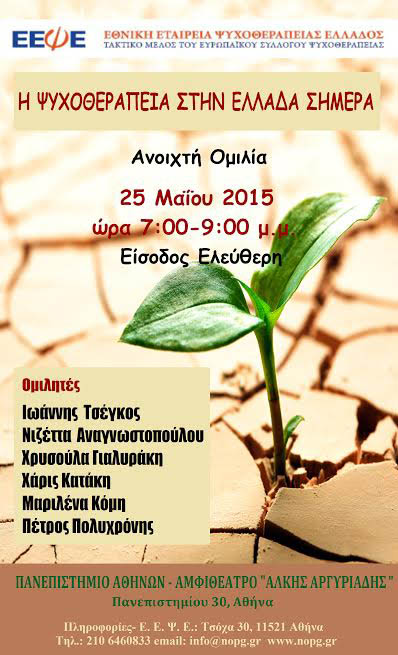 Στο πλαίσιο αυτής της προβολής η Εθνική Εταιρεία Ψυχοθεραπείας Ελλάδος διοργανώνει την Δευτέρα, 25 Μαΐου 2015 και ώρα 7:00-9.00 μ.μ. στο Πανεπιστήμιο Αθηνών, Πανεπιστημίου 30, Αθήνα, στο Αμφιθέατρο «Άλκης Αργυριάδης» ανοιχτή ομιλία με θέμα: Η Ψυχοθεραπεία στην Ελλάδα σήμερα