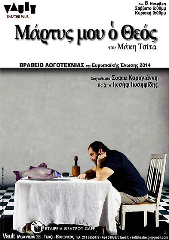 Συνεχίζονται λόγω επιτυχίας οι παραστάσεις του έργου του Μάκη Τσίτα «Μάρτυς μου ο Θεός» που τιμήθηκε με το Βραβείο Λογοτεχνίας της Ευρωπαικής Ένωσης 2014, σε σκηνοθεσία Σοφίας Καραγιάννη και με τον Ιωσήφ Ιωσηφίδη στο ρόλο του Χρυσοβαλάντη, στον Πολυχώρο Vault, κάθε Σαββάτο στις 18:00 και Κυριακή στις 21:00.
