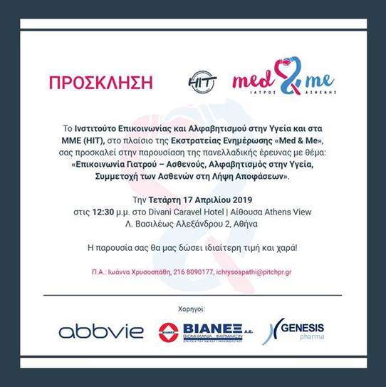 Εκ μέρους του Ινστιτούτου Επικοινωνίας και Αλφαβητισμού στην Υγεία και στα ΜΜΕ (ΗΙΤ), στο πλαίσιο της Εκστρατείας Ενημέρωσης «Med & Me», σας προσκαλούμε την Τετάρτη 17 Απριλίου 2019 & ώρα 12:30 μ.μ. στην παρουσίαση της πανελλαδικής έρευνας με θέμα: «Επικοινωνία Γιατρού – Ασθενούς, Αλφαβητισμός στην Υγεία, Συμμετοχή των Ασθενών στη Λήψη Αποφάσεων», στο Divani Caravel Hotel.