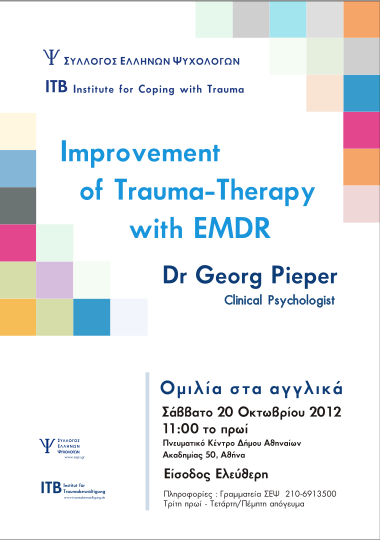 Ο Σύλλογος Ελλήνων Ψυχολόγων σας προσκαλεί στην ομιλία του Dr Georg Pieper, διευθυντού του Institute for Coping with Trauma με θέμα «Improvement of Trauma – Therapy with EMDR» το Σάββατο 20 Οκτωβρίου 2012 στις 11:00 το πρωί στο Πνευματικό Κέντρο του Δήμου Αθηναίων.