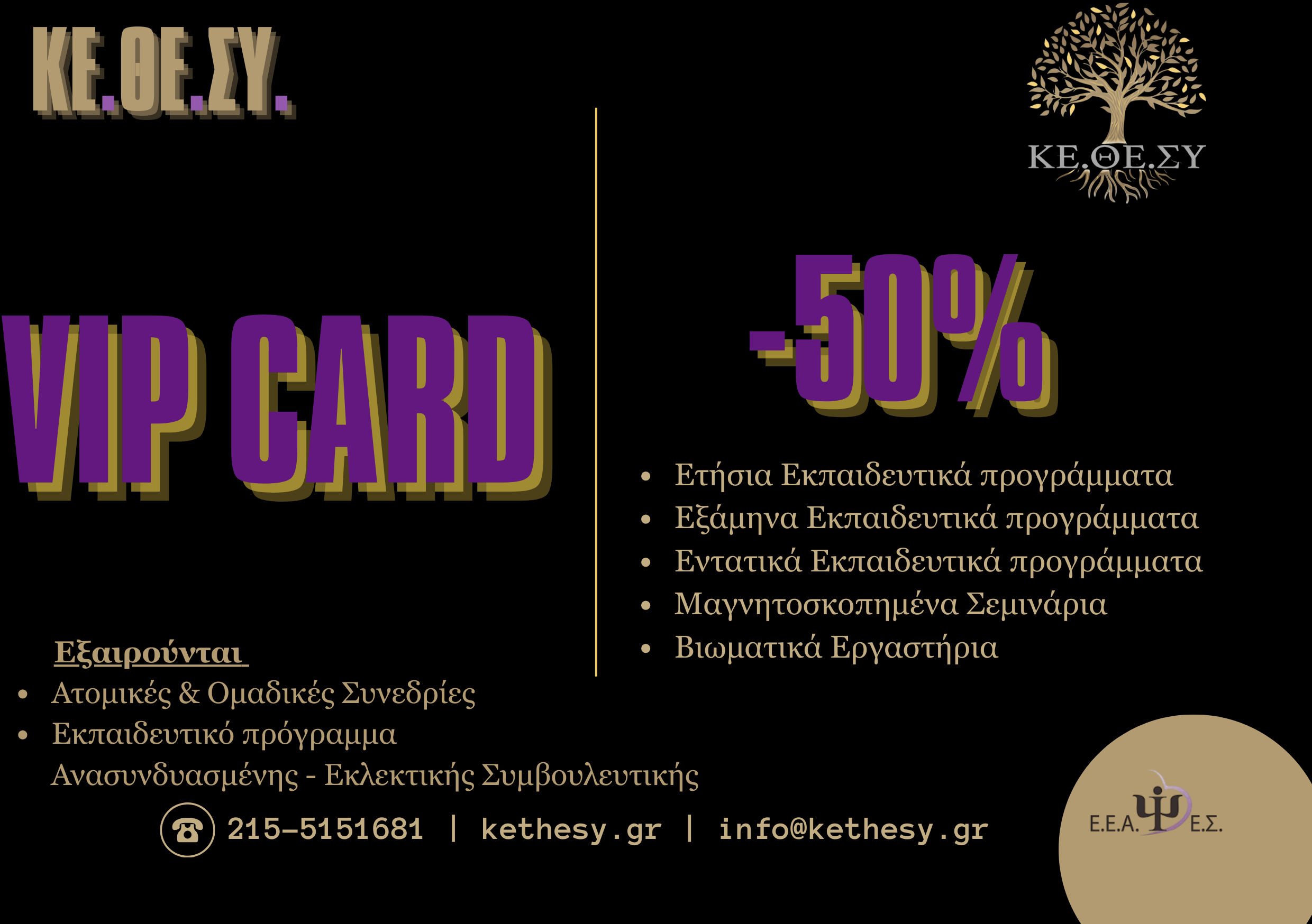 Μόλις κερδίσεις την VIP CARD θα έχεις -50% σε όλα τα προγράμματα & σεμινάρια του ΚΕΘΕΣΥ!!!
