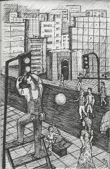 Δεν είχε καιρό για χάσιμο. Προχώρησε προς τον ανελκυστήρα χοροπηδώντας και χτυπώντας με τις τεράστιες παλάμες του το σώμα του, αφού παράλληλα προσπαθούσε να ξεσκονίσει την λερωμένη, ολόσωμη φόρμα εργασίας του. Πάτησε το κόκκινο κουμπάκι κι απέμεινε να περίμενει, με τα χέρια σταυρωμένα και το βλέμμα χαμηλά. Μα πόση σκόνη είχε απομείνει ακόμη στα παπούτσια του! Έβγαλε ένα κομμάτι στουπί από την τσέπη του και τα γυάλισε.